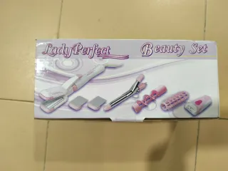 Set de belleza LadyPerfect con varios accesorios. - Incluye plancha y otros utensilios. - Diseño en color rosa y blanco.