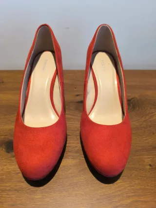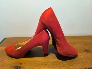 Zapatos rojos ante, tacón 9 cm. Aunque talla 41 es más un 41.5. tiene una pequeña plataforma en parte delantera, tipo Mary Jane. Envío por correo certificado previo pago de tasas y producto y pago con bizum en el momento del envío.