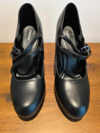 Zapatos de salón negros con tacón 11cm. Doble hebilla de sujeción. Usados 3 veces en eventos. Envío por correo certificado previo pago de tasas y producto por Bizum en el momento del envío.