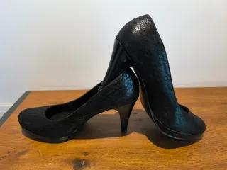 Elegantes zapatos de salón con un llamativo efecto piel de serpiente. - Tacón 9 cm - Pequeña plataforma delantera Usados 2 veces en eventos Envío por correo certificado previo pago de tasas y producto por Bizum en el momento del envío