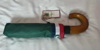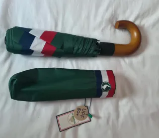 Paraguas plegable con el distintivo logo de la marca. - Diseño compacto y fácil de transportar. - Color verde oscuro. No se ha usado nunca