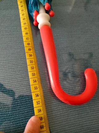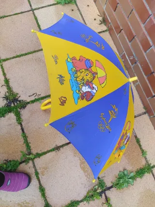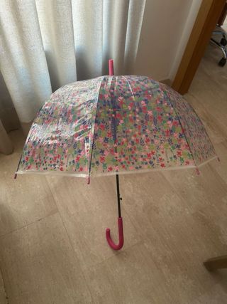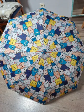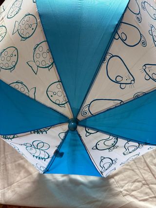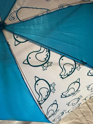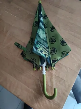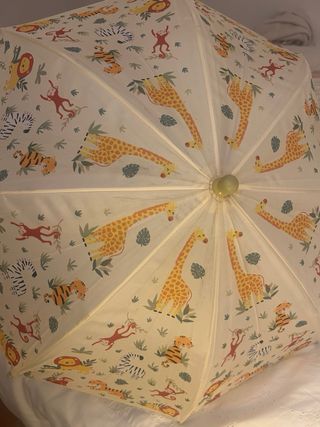 Paraguas infantil con un estampado diferente y original. - Mango de plástico y curvo para un agarre cómodo. - Varillas metálicas resistentes y en buen estado. - Cierre con velcro. - La bolita del extremo está un poco desgastada de apoyarla en el suelo.