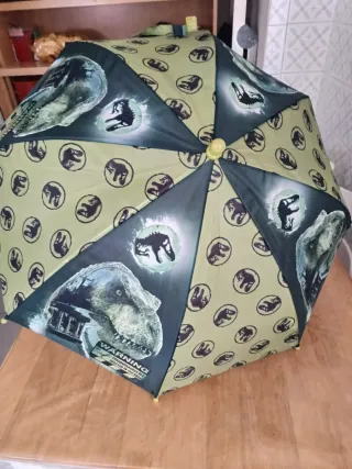 Paraguas con diseño de Jurassic World y dinosaurios. - Ilustraciones de dinosaurios y el logo de Jurassic World. - Colores verde y negro.