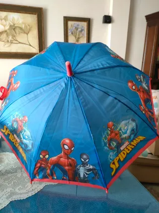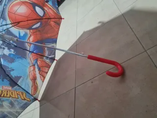 Paraguas infantil con diseño de Spiderman. - Tejido resistente con estampado. - Mango y varillas de plástico.