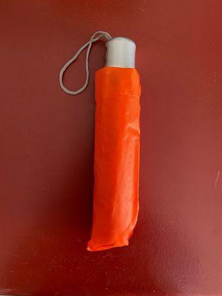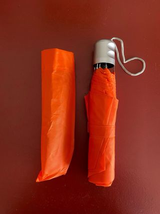 Paraguas plegable de color naranja brillante. Incluye una cuerda para colgarlo. - Mango plateado. - Diseño compacto para llevar a cualquier parte.