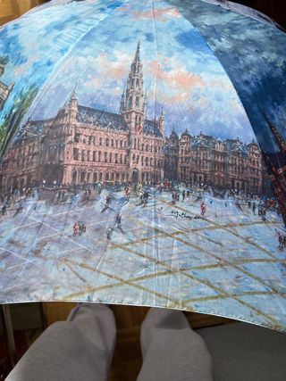 Comprado en París, Paraguas con un diseño artístico inspirado en París. Presenta una pintura detallada de un edificio emblemático y una plaza con gente. - Ilustración de estilo pictórico. - Detalles en tonos azules y multicolor.