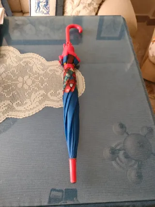 Paraguas infantil con diseño de Spiderman. - Color azul con estampado. - Borde de color rojo. - Mango de color rojo.