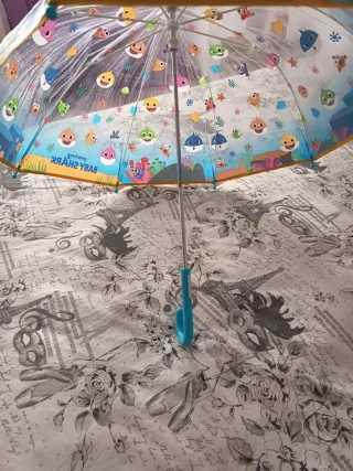 Paraguas infantil con un divertido diseño de Baby Shark y el fondo marino. Es transparente y cuenta con un asa de color azul. - Personajes de Baby Shark. - Diseño de fondo marino. - Material transparente.