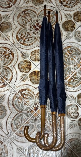 Conjunto de paraguas en tonos azul y marrón. - Paraguas con mango curvo. - Diseño clásico y elegante. Precio 1:2 euros Precio 3: 5 euros Precio 5:8 euros Precio 17: 25 euros