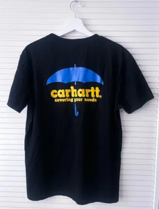 Camiseta negra de la marca Carhartt con un diseño gráfico en la espalda. - Estampado de paraguas azul y amarillo. - Texto covering your needs debajo del logo.