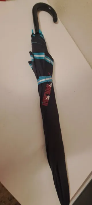Paraguas plegado con un diseño moderno y práctico. - Asa curva de color negro. - Tiras de sujeción con detalles en azul y blanco. - Banda de tela con diseño gráfico y texto.