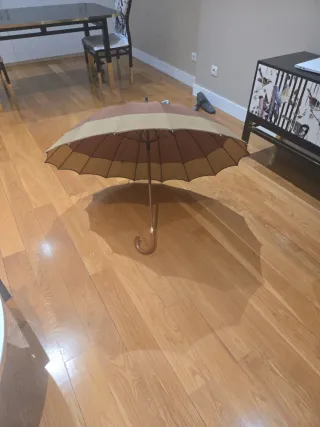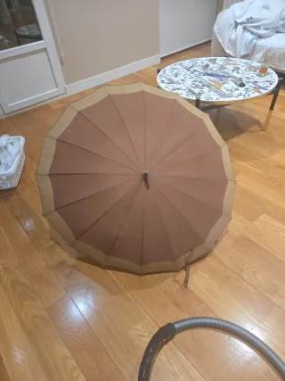 Paraguas plegable en color beige, casi nuevo y con muy poco uso. - Diseño compacto y fácil de transportar. - Mecanismo de apertura y cierre funcional.