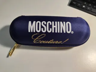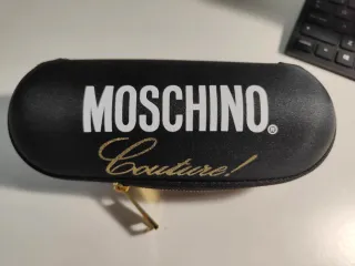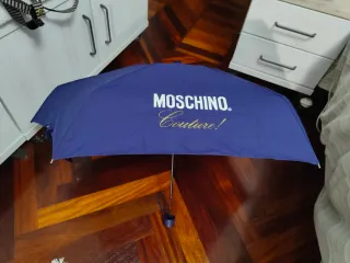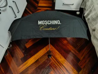 Elegante paraguas con funda de la marca Moschino. - Diseño en color negro con detalles dorados. - Cremallera dorada.