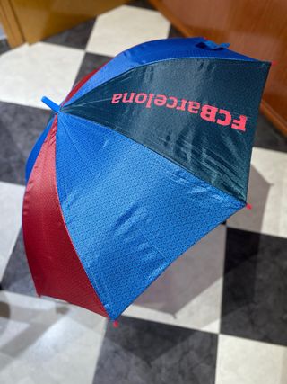 Paraguas con el escudo del FCB. - Diseño en color azul. - Escudo del FCB en el centro. Esta casi nuevo, las varillas totalmente bien lo unico la pegatina que esta peor se ve en la foto la otra esta bien