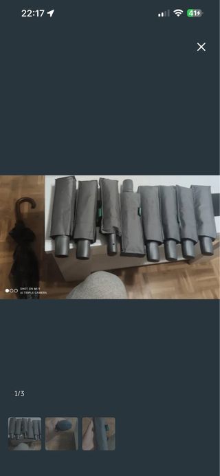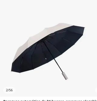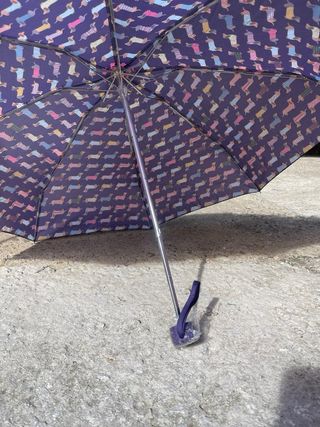 Paraguas plegable con un diseño elegante. - Mango curvo metálico. - Detalle de borde en color morado. - lo único una esquina que le faltaban trozos de varilla pero que se abre al completo y no afecta a nada