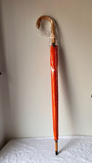 Paraguas de color naranja. - Mango curvo. - Puntas rojas en las varillas.