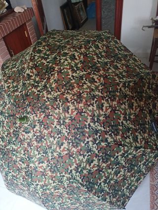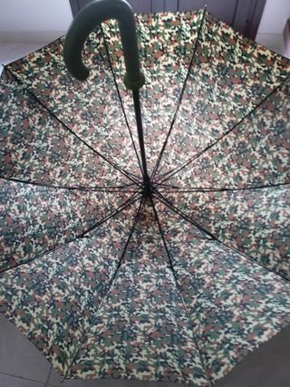 Paraguas de gran tamaño con estampado de camuflaje. - Diseño de camuflaje en tonos verdes y marrones. - Mango de color verde.