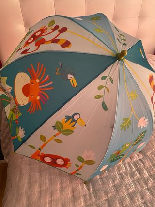 Paraguas infantil con un alegre diseño de animales de la selva y colores vivos. - Ilustraciones de leones, monos y tucanes. - Mango curvo de color amarillo. - Ideal para proteger a los más pequeños de la lluvia. - tiene un redondo transparente para poder vee
