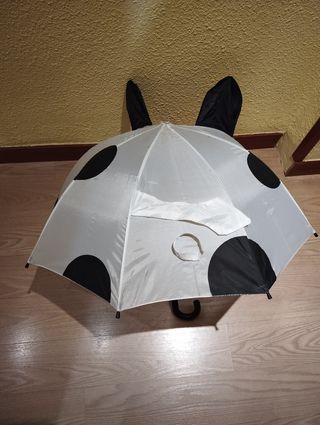 Tres paraguas pequeño para niñ@s con dibujo de vaca y la forma de dos orejas y dos con dibujo de rana y la forma de dos ojos.
