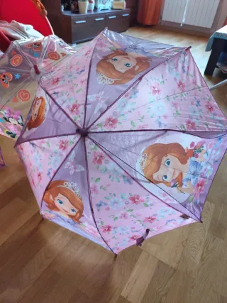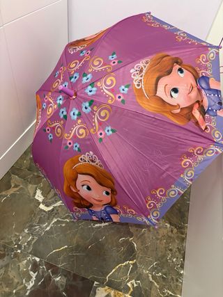 Paraguas infantil con diseño de Princesa Sofía. El mango es de color morado y tiene el nombre Princess grabado. - Mango de color morado. - Diseño de Princesa Sofía. intacto, sin desperfectos