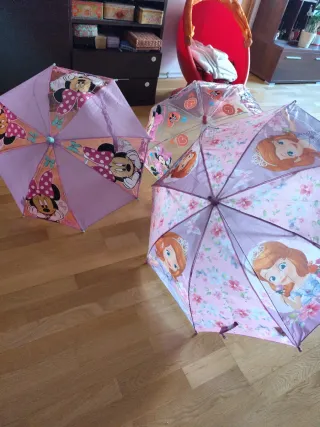 Lote de paraguas infantiles con diseños de personajes. - Paraguas con estampado de Minnie Mouse. - Paraguas con diseño de Princesa Sofía. - Ideal para protegerse de la lluvia. El precio es por los tres juntos .