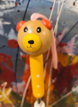 Paraguas infantil con un divertido diseño. - Mango de madera con forma de osito, tanto en el mango como en la punta del paraguas - Paraguas de color rosa. - Detalles en amarillo en el mango.