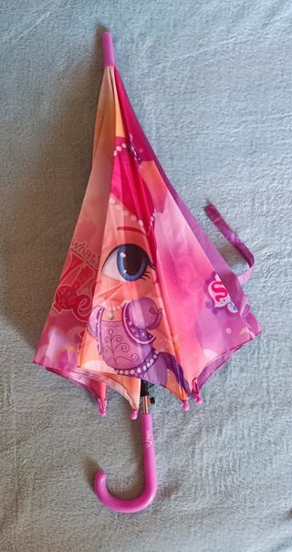 Paraguas infantil con un diseño colorido y divertido. - Ilustraciones de Shimmer & Shine. - Mango curvo para fácil agarre. - Cierre con cinta.