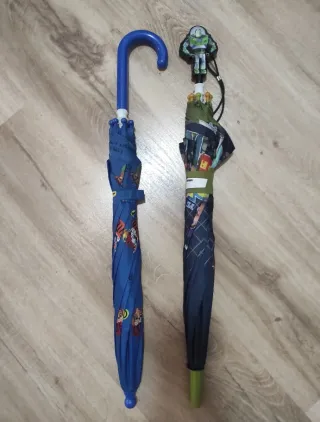 Dos paraguas infantiles, uno con diseño de Paw Patrol y otro con Buzz Lightyear. - REGALO el paraguas con estampado Buzz está una una corredera rota pero se puede utilizar.