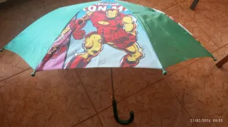 Paraguas infantil con diseño de Iron Man. - Ilustración de Iron Man en el panel central. - Paneles laterales de color verde y turquesa.