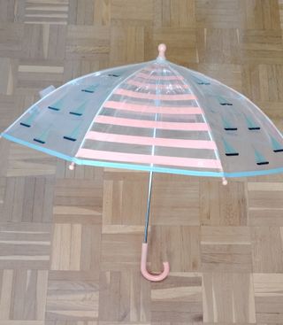 Paraguas infantil transparente con un divertido diseño de veleros. La apertura es manual. Ideal para los más pequeños. Medidas: Altura sin el mango: 45 cm. Diámetro: 38 cm. - Diseño con rayas rosas y borde azul claro. - Mango y punta en color rosa.