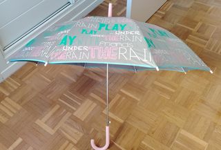 Paraguas infantil con un divertido diseño de texto. - Diseño con palabras como Rain, Play, Under the rain, Friends. - Mango y puntas en color rosa. - Borde azul. -La apertura automática. Ideal para los peques. -Medidas: Altura sin el mango: 63 cm Diámetro: 52 cm
