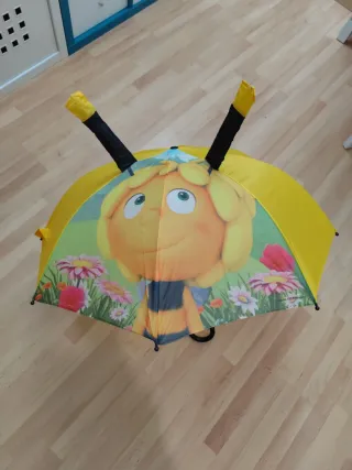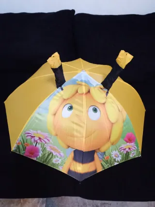 Paraguas infantil con un divertido diseño de la Abeja Maya. Nuevo a estrenar, abierto solo para la foto - Diseño de la Abeja Maya. - Antenas decorativa. - Colores vivos. - Silvato en el mango