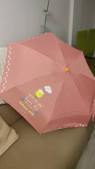 Paraguas infantil con un diseño alegre y un mensaje motivador. - Diseño con sol, nubes y gotas de agua. - Mensaje HOY ES UN BUEN DÍA PARA TENER UN GRAN DÍA. - Pequeño texto wonderful en la parte inferior.