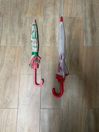 Dos paraguas infantiles con un diseño alegre y colorido. - Paraguas con estampado floral en tonos verdes y rosas. - Paraguas transparente con detalles rojos y dibujos.