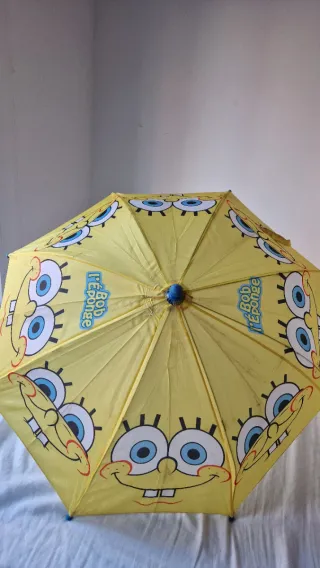 Paraguas infantil con el diseño de Bob Esponja. Paraguas de color amarillo.Ilustraciones de Bob Esponja por toda la tela.Tamaño pequeño.Usado, tiene un pequeño desperfecto que muestro en la tercera fotografía.Mas artículos en mi perfil. Entrego en mano en Alcorcón o envío por la aplicación.