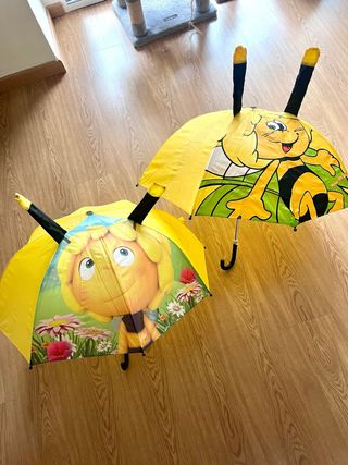 Paraguas infantiles de la Abeja Maya muy originales, en color amarillo. Tienen antenas en la parte superior, ideales para peques: divertidos y fáciles de reconocer. ✅ Tamaño infantil ✅ Ligeros y cómodos de usar ✅ Perfectos para días de lluvia o para regalar Tienen unas manchitas en la parte superior (preguntar por fotos) pero están perfectamente bien para usarse. Se venden juntos o por separado. Cualquier duda, ¡escríbeme sin problema! 😊