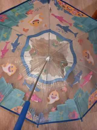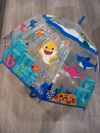 Paraguas transparente con diseño de Baby Shark, ideal para los más pequeños. Presenta un divertido estampado submarino. - Diseño transparente con personajes de Baby Shark. - Borde decorativo azul y blanco. - Mango y puntas de seguridad en color azul.