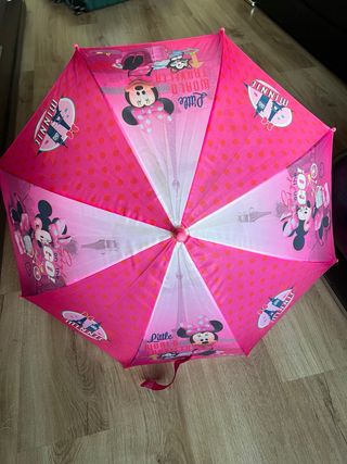 Paraguas infantil con diseño de Minnie Mouse. - Ilustraciones de Minnie y elementos decorativos. - Mango y punta de seguridad en color rosa.