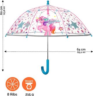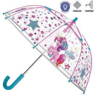 Paragüas transparente para niña con un diseño divertido. - Detalles de estrellas y unicornios - Mango curvo en color lila. - Puntas rosas en las varillas.