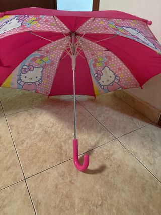 Paraguas infantil con un divertido diseño de Hello Kitty. - Color rosa vibrante. - Estampado de Hello Kitty y lazos. - Detalle de manzana con el logo de Hello Kitty. - Tiene dos enganchones muy pequeños los podeis ver en la ultima foto