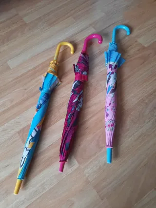 Conjunto de tres paraguas infantiles con diseños variados. - Paraguas con mango curvo. - Mecanismo de apertura manual, fácil - Puntas de seguridad en las varillas. Los 3 paraguas 4 € Se recogen en Vicalvaro
