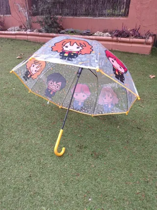 Paraguas transparente con divertidos dibujos de Harry Potter. - Diseño con personajes de la saga. - Borde y mango de color amarillo.