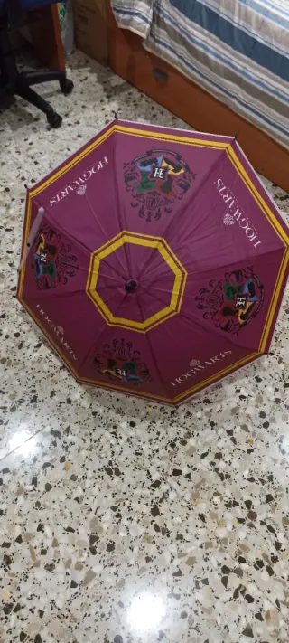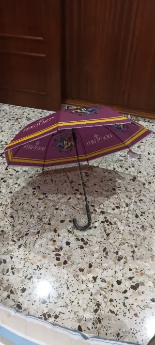 Paraguas con diseño de Harry Potter y el escudo de Hogwarts. Perfecto para los fans más jóvenes. - Diseño en color morado y detalles dorados. - Mango curvo para un agarre cómodo. - Apertura y cierre automático
