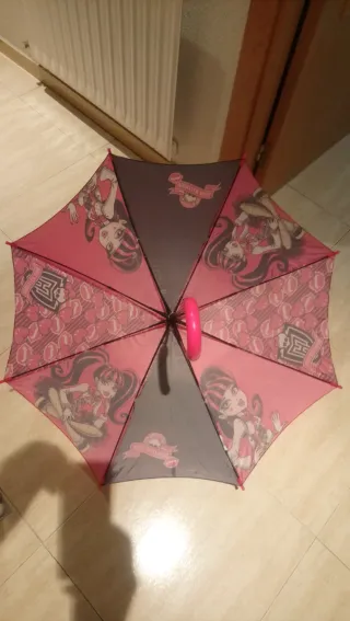 Paraguas infantil con diseño de Monster High. - Colores: rosa y negro. - Ilustraciones de personajes de Monster High. - Patrón de labios y el logo de la marca.