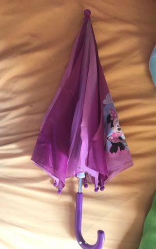 Paraguas infantil con diseño de Minnie Mouse. Ideal para los días de lluvia. - Mango curvo morado. - Punta decorada con bolitas. - Estampado de Minnie Mouse.