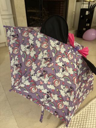 Paraguas infantil con un divertido estampado de Minnie Mouse y unicornios. Perfecto para los días de lluvia. - Diseño multicolor con fondo morado. - Personajes de Minnie Mouse y unicornios. - Detalles de arcoíris y nubes.