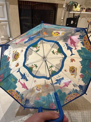 Paraguas infantil con divertidos dibujos de Baby Shark y sus amigos marinos. Ideal para los días de lluvia. - Diseño transparente con estampado de personajes. - Borde y mango en color azul. - Ilustraciones de peces, tiburones y palmeras.