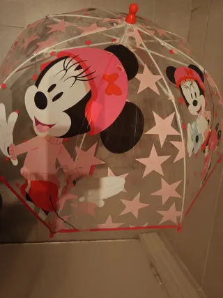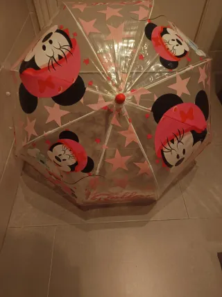 Paraguas transparente con diseño de Minnie Mouse y estrellas. Casa Cerdà. En muy buen estado, poco uso y funcionamiento correcto. Entrega en mano eixample izquierdo. No envío porque no tengo para envolver. - Personaje: Minnie Mouse. - Diseño: Estrellas. - Material: Transparente.