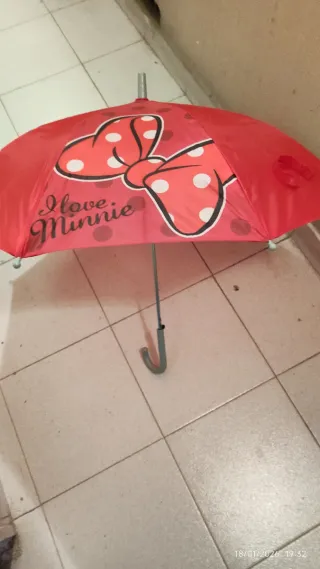 Preciosa sombrilla infantil con la imagen de Minnie Mouse. Ideal para días de lluvia. - Diseño alegre y colorido con rayas y flores. - Perfecta para proteger del agua a las más pequeñas de la casa. - Presenta algunos signos de uso, pero en general está en buen estado.