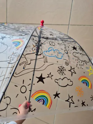 Paraguas transparente con divertidos dibujos infantiles: con unicornios y arcoíris,nubes, estrellas. Está nuevo, sin estrenar y con su etiqueta original. En el mango tiene un pequeño círculo para poder engancharle una etiqueta con su nombre. - Apto para mayores de 3 años.